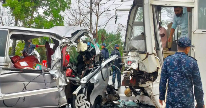 বৃহস্পতিবার উপজেলার মহাসড়কে এ দুর্ঘটনা ঘটে। প্রত্যক্ষদর্শীরা জানান, দ্রুতগতির একটি যাত্রীবাহী বাসের সঙ্গে একটি মাইক্রোবাসের মুখোমুখি সংঘর্ষ হলে ঘটনাস্থলেই কয়েকজন নিহত হন এবং অনেকে গুরুতর আহত হন।